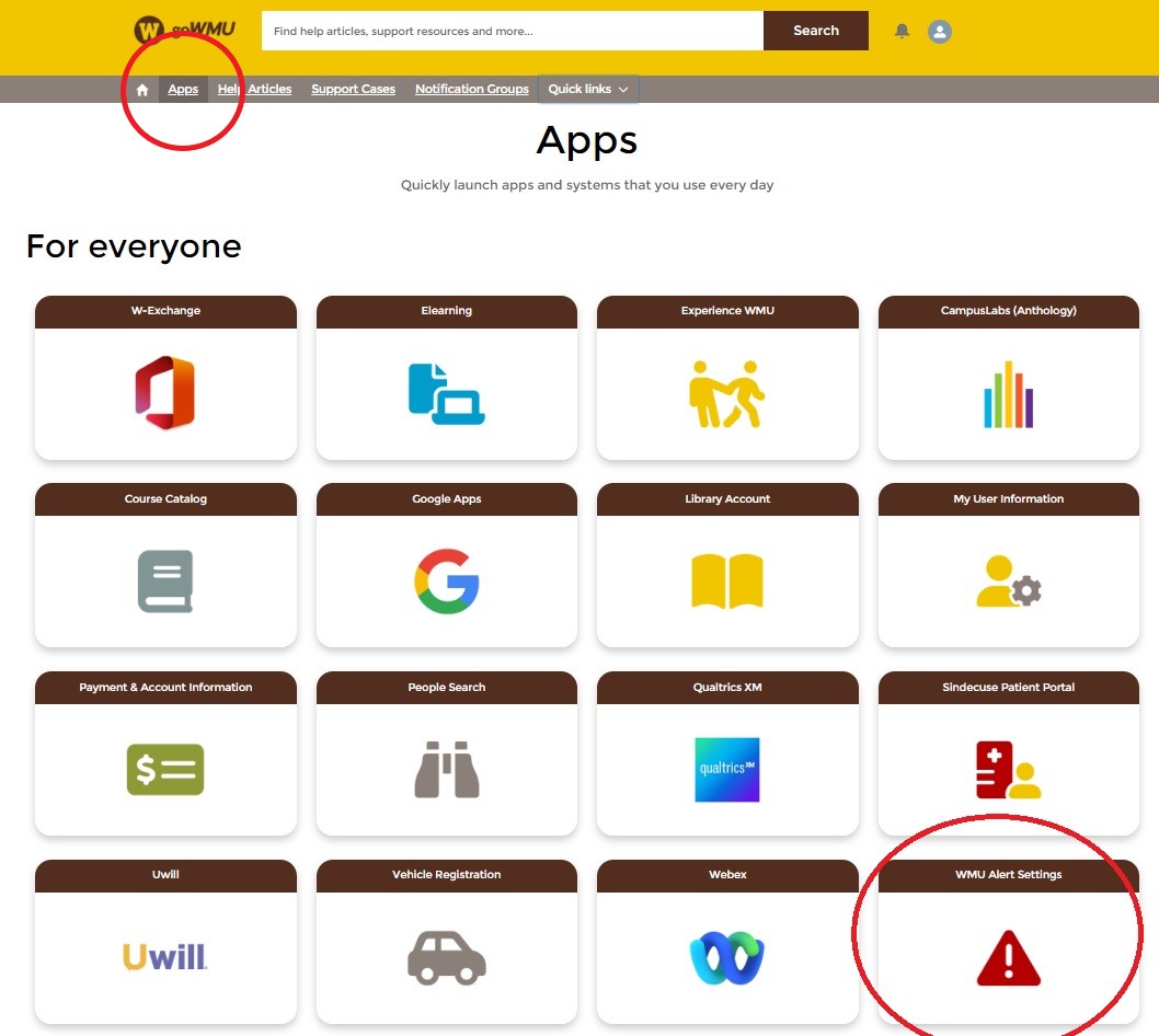 Register your phone number and/or change your preferences by logging in to goWMU, clicking on Apps (top left), and then clicking the WMU Alert Settings badge.